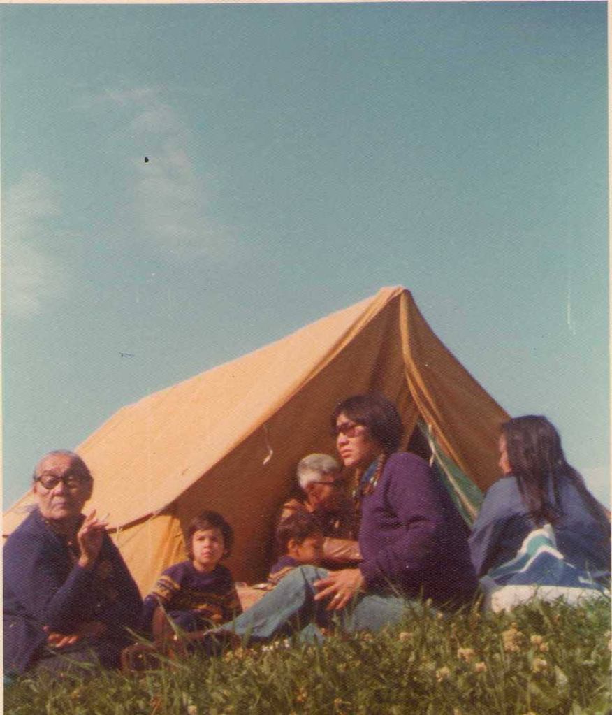 “One day long ago, I took mama, my mom, and Adeline TripdeRoche to Lac St. Anne with my old car. My car had holes on the floor, which I tried to cover with a cardboard paper. Highway 63 was still a gravel road. I tell you each time we hit a bump puffs of dust would fill the car. The ladies in the back seat all had polyester suits on. We would stop on the way a couple of times getting out to stretch. My goodness they all would brush the dust off their suits, all the while laughing about it.