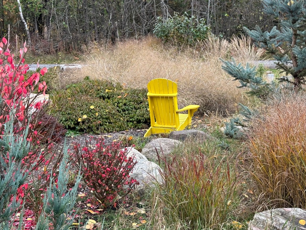 Simplicity brings me joy. A beautiful flower is perfect. And drinking tea mindfully brings me as much joy as admiring a pretty flower. I look ahead to having my tea in the garden next summer. I will be sitting in this beautiful yellow Muskoka chair. My friend Steve built the chair.
